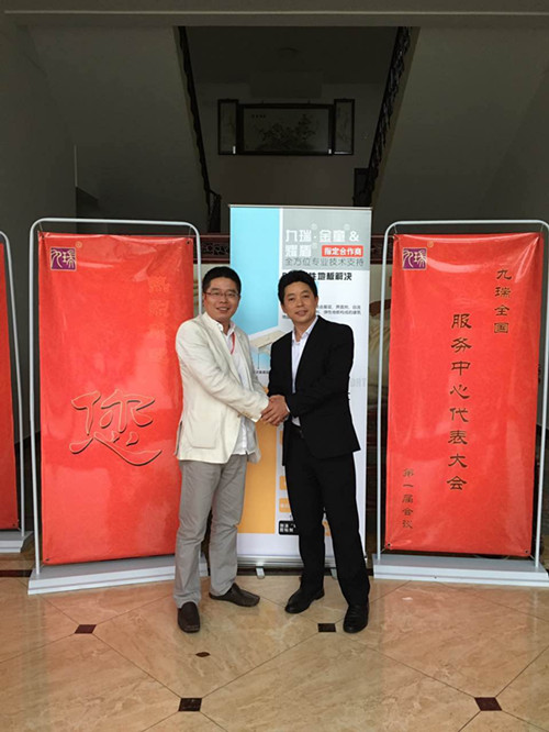 (左起:上海耀盾装饰材料有限公司刘总和湖南九瑞建材科技有限责任公司卓总)